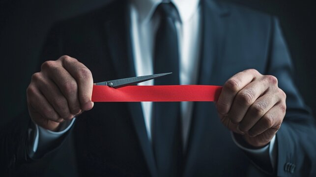 A businessman cutting through red tape with scissors, trying to free up blocked trade, bureaucratic obstacle, international trade solution