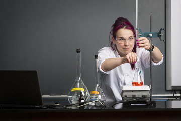 The woman who’s the scientist is demonstrate the titration technician