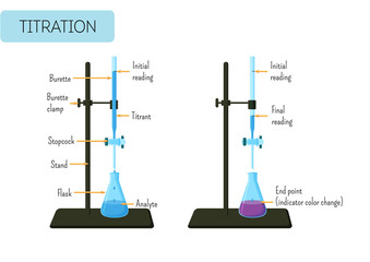 Titration procedure. Titrant in a burette and analyte in a conical flask, scientific experiment in the laboratory. Scientific vector illustration.
