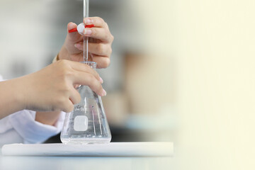 Scientist is holding burette and erlenmeyer flask. free space on right. Focus on finger holding burette.