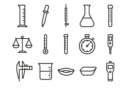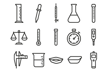 Essential Measurement Tools. Measurement tools. Line icon set of measurement tools: graduated cylinder, pipette, burette, volumetric flask, balance scale,