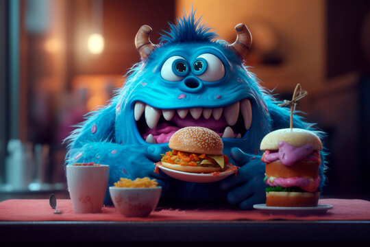 Funny cheeseburger lover. Gluttony. Generative AI. Burger day. Cute blue monster overeats street food. Illustration for children's menu, pizzeria, article, cover. Cartoon with junk food concept