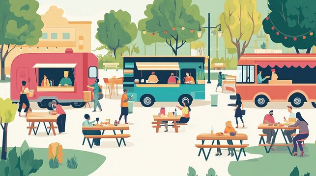 Flat vector illustration of a lively food truck park, with colorful trucks, people eating, and picnic tables scattered around.