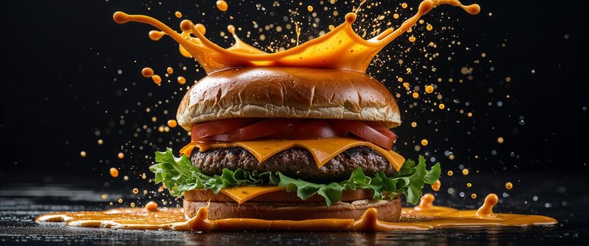 Amazing hamburger studio shot with sauce splash on black background featuring juicy beef patty cheese tomato lettuce and sesame seed bun for fast food lover 200c