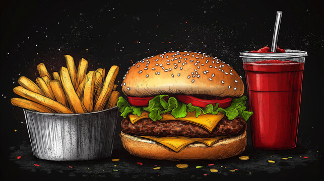 Crispy golden fries sit beside a juicy burger layered with melted cheese, fresh lettuce, and ripe tomatoes, accompanied by a vibrant drink. A feast for any fast food lover
