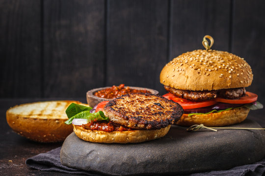 Traditional burgers with meat, sauce and vegetables on a dark background.