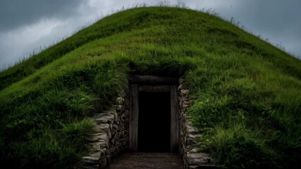 Ancient grass covered mound with stone entrance revealing a dark interior, possibly a neolithic passage tomb or burial site.