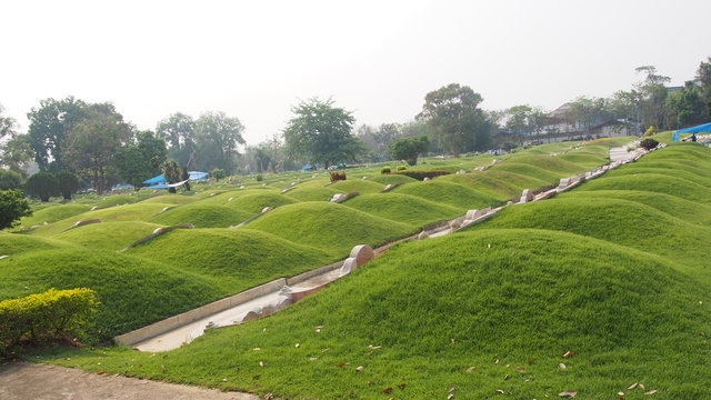 Chinese cemetery, mound and slope grass graves of chinese graveyard