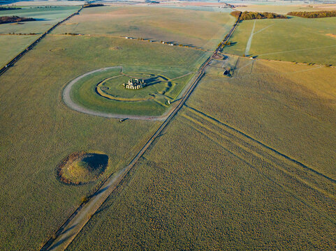 Aerial shot of Stonehenge, The Avenue and a burial mound, Wiltshire, UK