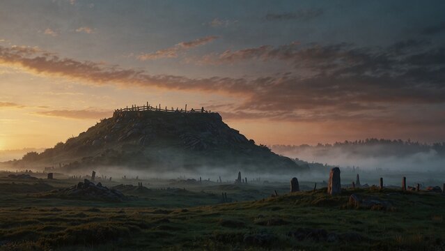 Norse ship burial mound at dawn cold mis