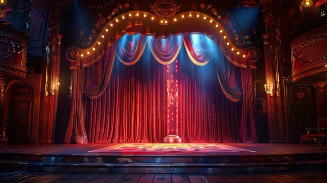 Empty vintage circus stage illuminated by spotlights, with red velvet curtains and a golden frame, creating an anticipation atmosphere