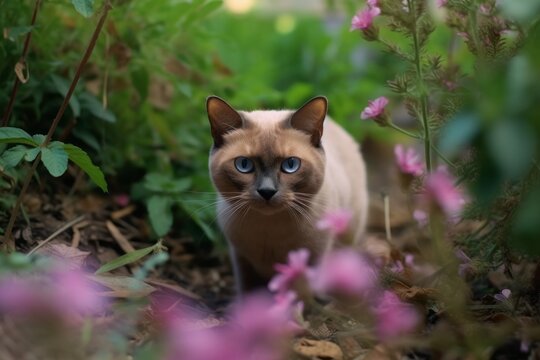 Medium shot portrait photography of a cute burmese cat exploring against a lush flowerbed. With generative AI technology