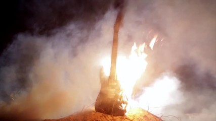 Electric guitar set on fite. Burning in slow motion. Authentic shot.