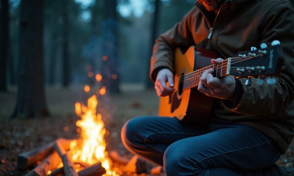 Acoustic guitar player by campfire moody forest atmosphere