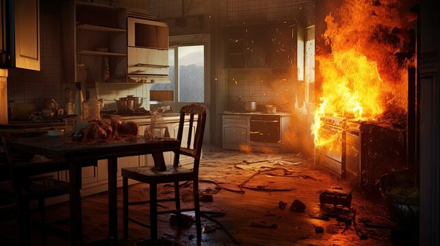 Papers and books burning in a home office causing chaos and destruction. Generative AI