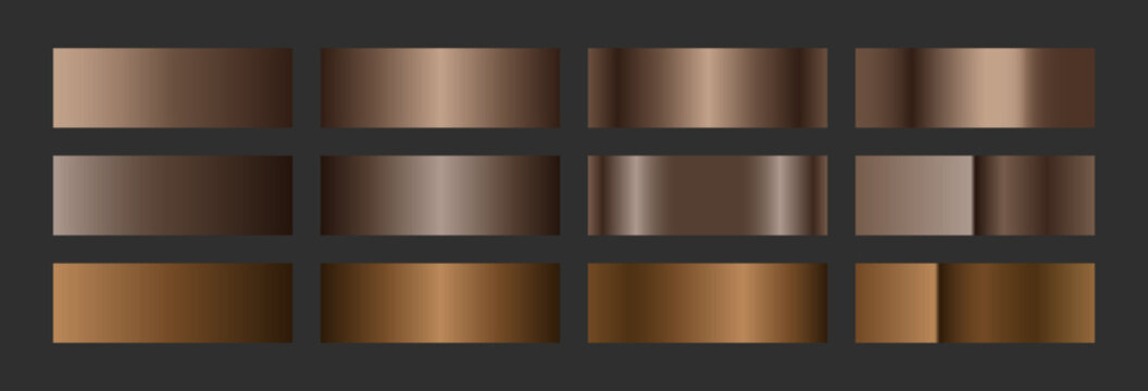 Elegant bronze gradient swatches collection. Metallic textures with polished foil shine and satin smooth. Glossy palette for vintage and luxury designs and branding