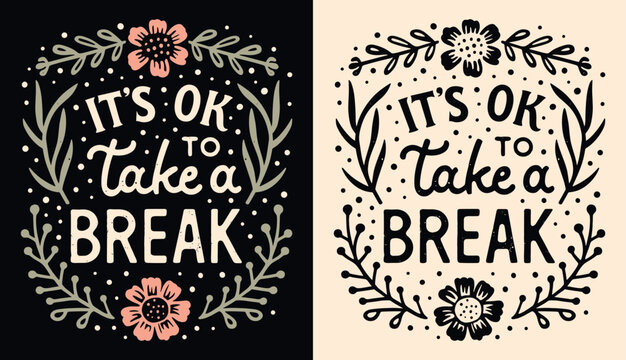 It's ok to take a break lettering self love mental health quotes self care isn't selfish burnout recovery. Cute floral cottagecore slow living aesthetic text for women shirt design poster print.