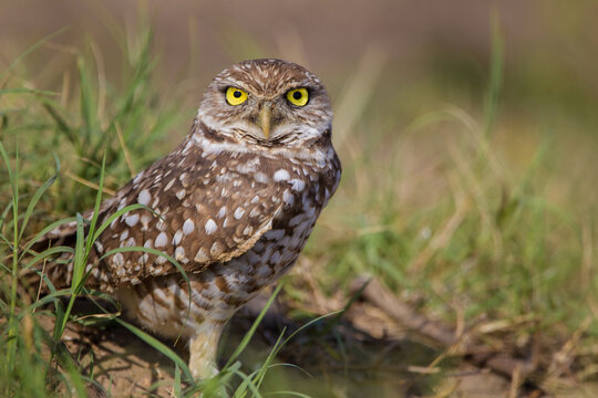 Burrowing owl above her nest, stands only about 12 inches tall.