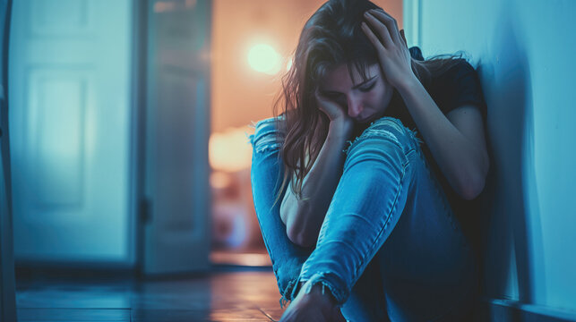 Depression Concept. Portrait Of Upset Young Middle Eastern Woman Crying At Home, Depressed Millennial Lady Burying Head In Knees While Sitting On Floor In, generative ai