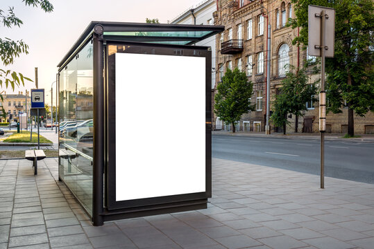 Mock Up Of Vertical Blank White Billboard At A Bus Stop On A City Street. Empty Outdoor Advertising Poster To Display Branding Campaign