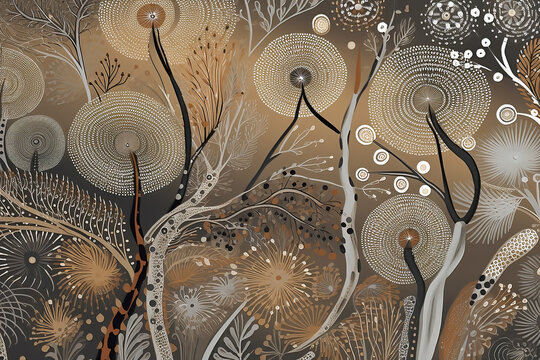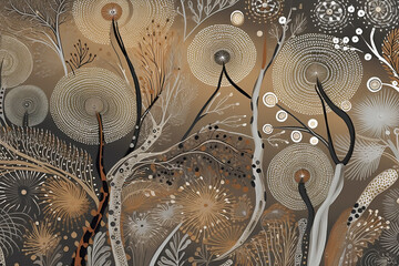 Australian Aboriginal dot painting style art dreamtime story of bush tucker food in neutral tones.