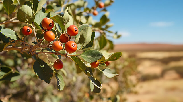 A detailed view of a bush tucker plant, native to the Australian Outback, with its edible fruits and distinctive leaves against the arid landscape