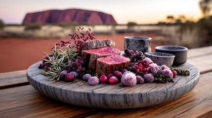 A plate of Australian bush tucker featuring kangaroo meat, wild berries, and native herbs, set on a rustic wooden board with the red sands of the Outback and Uluru in the distance.