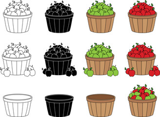 Apple Picking Basket or Bushel Clipart - Outline, Silhouette and Color