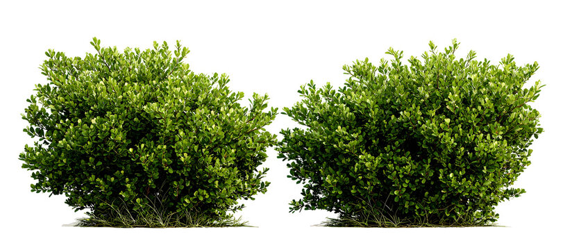 Pair of green shrubs, lush bushy landscape plant collection. Isolated on transparent background.