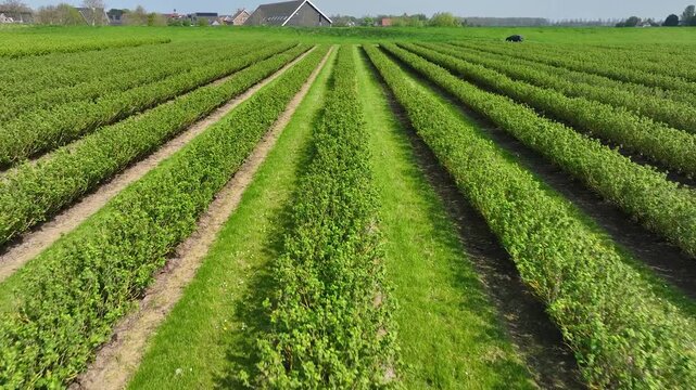 4K Drone Shot Over Plantations of Hazelnut or other bushy agroculture. Hazelnut trees agriculture cultivation field aerial view