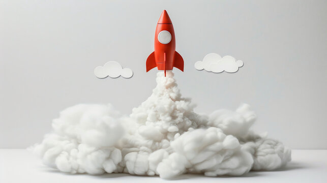 rocket launching with rising graph, surrounded by white clouds on white background. Concept of growth and success