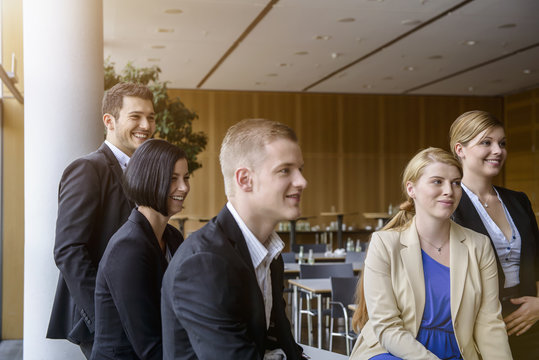 Businesswomen and men listening at business meeting in office