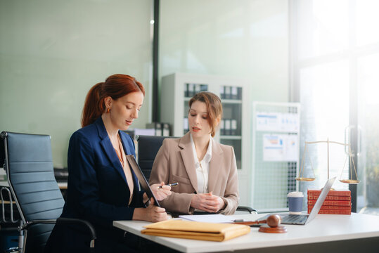 business people and lawyers discussing contract papers sitting at the table. Concepts of law, advice, legal services.