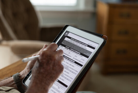 Applicant filling in company application form document applying for job, or registering claim for health insurance