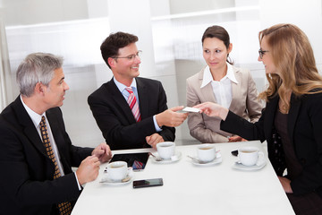 Businesspeople exchanging cards over coffee