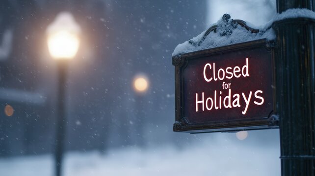 Closed shop entrance in cozy winter style, warm golden lights and snowy street atmosphere representing holiday season and business closure