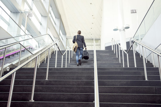 Young business man calling talking on the mobile phone on coffee break from office building outside. Businessman walking on street commute lifestyle.