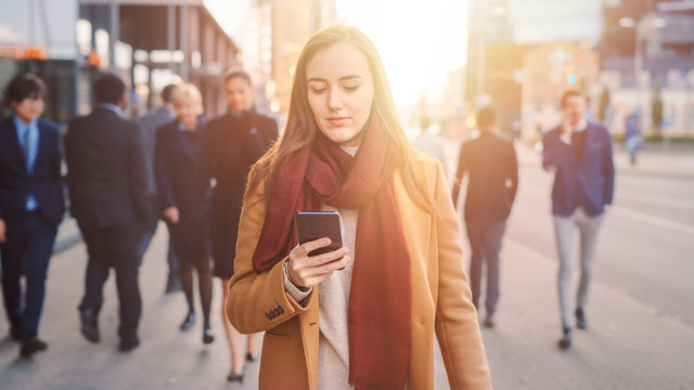 Young Casually Dressed Female is Using a Smartphone on a Street. Business People and Office Managers Walk Pass on Their Way to Work. She Looks Confident while Checking Phone. Shot with Warm Sun Flare.
