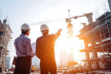 Structural engineer and foreman worker with touch pad discuss, plan working for the outdoors building construction site.
