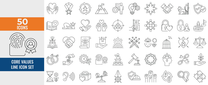 Core Values Line Icon Set – Thin Linear Vector Symbols of Business Ethics, Teamwork, Leadership, Integrity, Trust, Innovation, Diversity & Sustainability