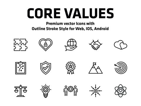 Set of thin line icons related to corporate social responsibility. Core values, impact, trust, support, care, social response