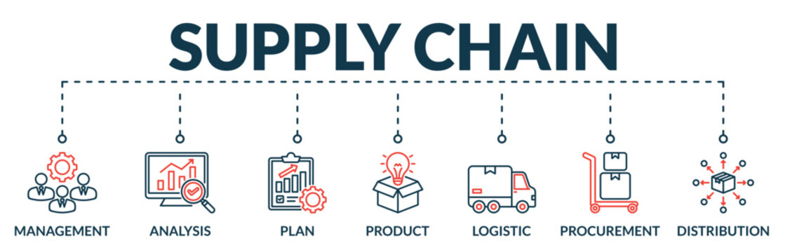 Banner of supply chain web vector illustration concept with icons of management, analysis, plan, product, logistic, procurement, distribution