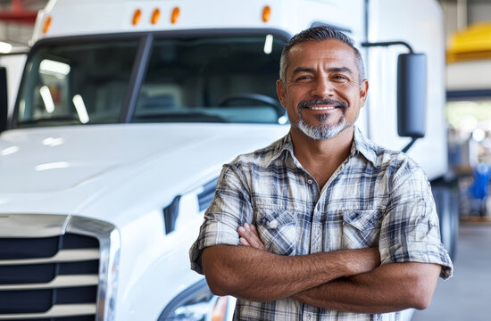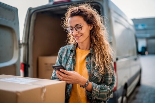 A smiling woman in a plaid shirt stands next to her delivery van, checking her phone while holding a cardboard box. Packages are visible inside the van, indicating a busy delivery day