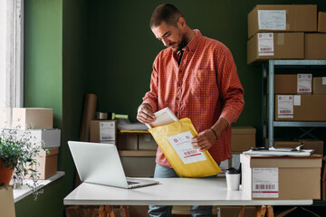 Close up of woman hands putting a letter inside an envelope on a desk at home or office