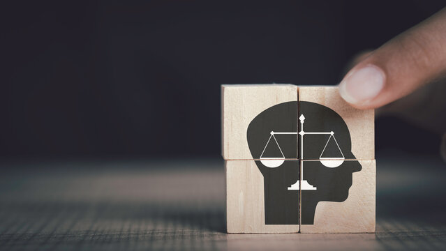 Business ethics concept. Ethics inside human mind. Business integrity and moral. Putting wooden cubes with ethics inside a head standing with other ethics icon. Company culture and sustainable success
