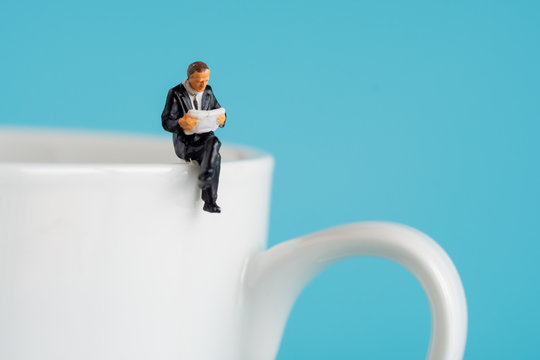 business miniature figures sitting and read a book, read newspaper, waiting, talking and relax on white cup of hot coffee..