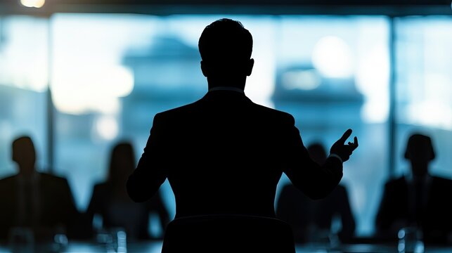 Silhouette of a business leader addressing a team in a conference room, with blurred figures in the background, symbolizing growth