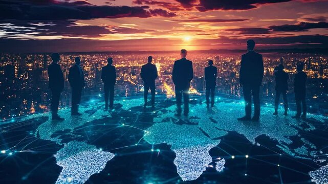 Silhouetted figures in formal attire converse at an indoor gathering, creating a sense of networking and business connections