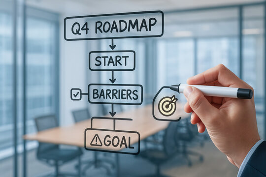 Q4 roadmap start barriers goal business strategy planning office meeting room hand marker flowchart target success challenge concept transparent board corporate teamwork process arrow diagram