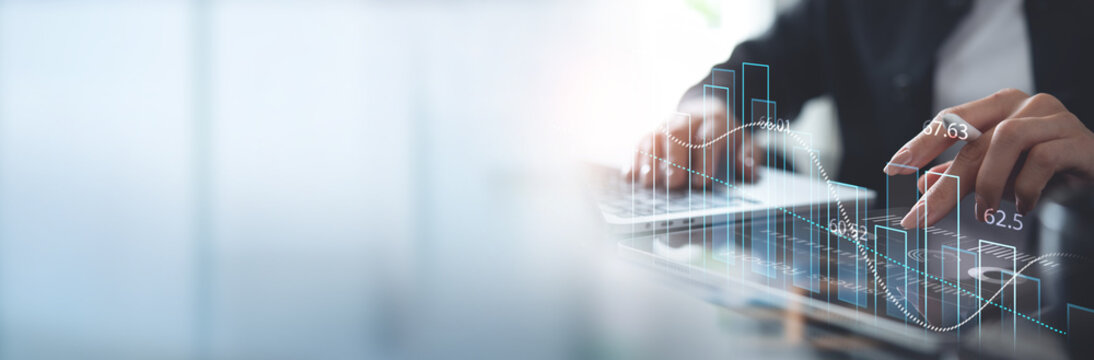 Business, finance and investment concept. Businessman using digital tablet analyzing and calculating financial data with economic graph growth chart, Business strategy and planning. market research